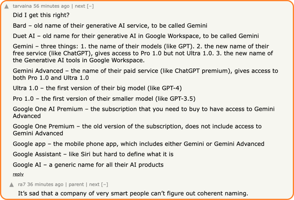 Paralelamente, todo el universo IA de productos de Google ha sufrido cambios de nombre, muy poco afortunados, pues inducen a confusión como demuestra este post de Hacker News: