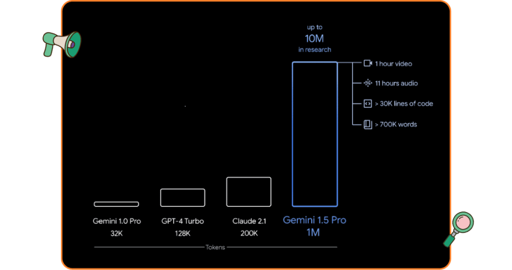 Una de las mejoras destacadas de Gemini 1.5 Pro es su notable aumento en rendimiento en comparación con la versión original: Gemini 1.5 Pro cuenta con una ventana de contexto de 1 millón de tokens. Para aclarar, 1 millón de tokens podría significar analizar 700.000 palabras, 30.000 líneas de código u 11 horas de audio, resumiendo, reformulando y citando el contenido. Una absoluta locura.