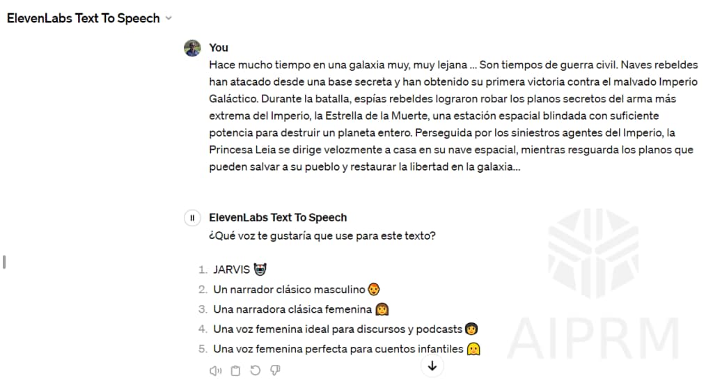 Paso 4: ChatGPT te dará varias opciones para la voz. Selecciona una y espera unos segundos, ChatGPT te dará un enlace a tu audio.