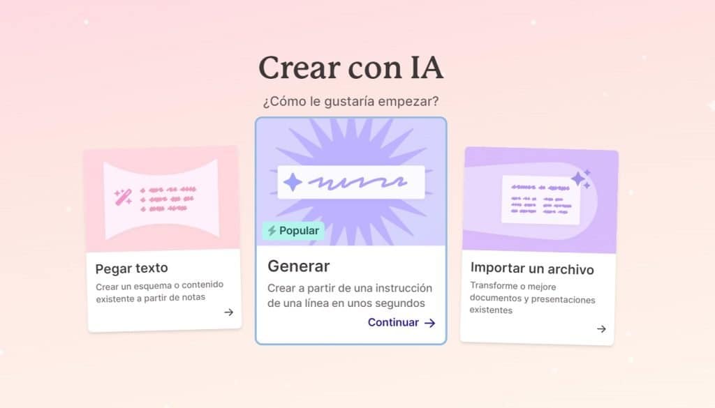 - Una vez que te hayas registrado (gratis), tendrás la opción de crear diapositivas pegando texto, subiendo un archivo o dándole una instrucción.