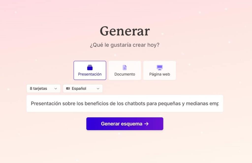 - En la siguiente pantalla, elige cuántas diapositivas quieres, el idioma, describe el contenido de las diapositivas y haz clic en generar.