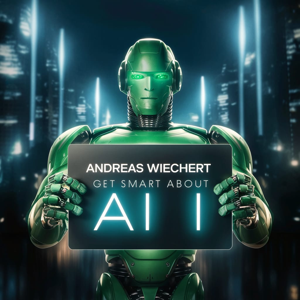 Prompt: A robot in green colour with a sign in its hands that says «ANDREAS WIECHERT – Get smart about AI»