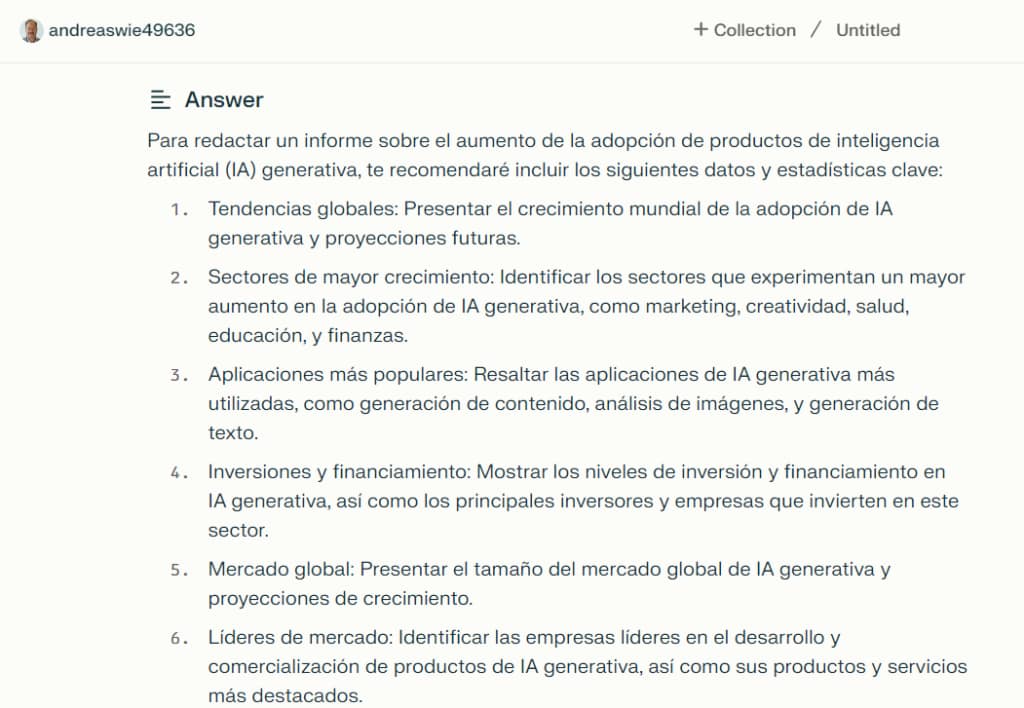 Completitud: La IA de Perplexity AI proporciona respuestas completas a las consultas de los usuarios. Esto significa que las respuestas no sólo proporcionan la información que el usuario está buscando, sino que también aportan contexto e información adicionales que pueden ayudar al usuario a comprender el tema con mayor profundidad.