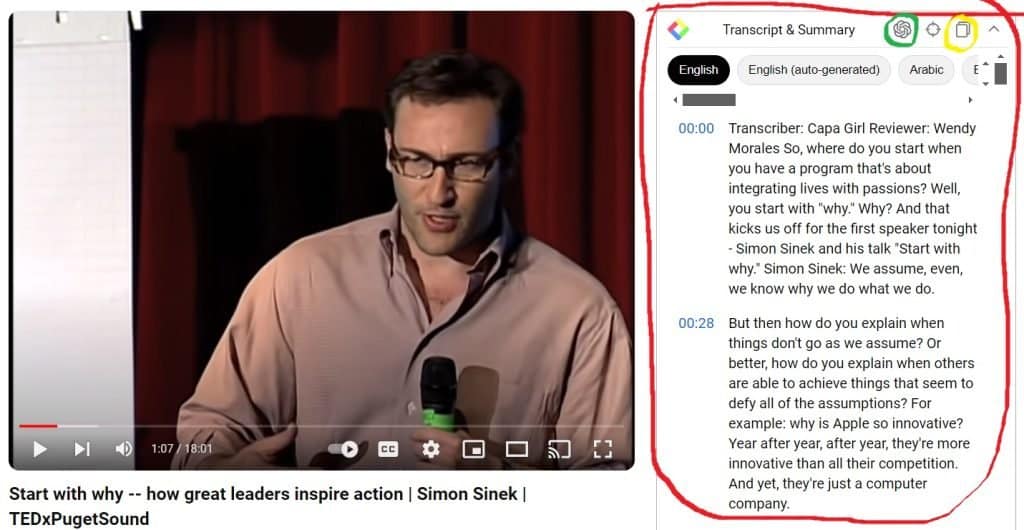 En mi caso, abrí el video de Simon Sinek «Start With Why» y automáticamente me apareció un área de transcripción y resúmen en el lado superior derecho del video (enmarcado en color rojo):
